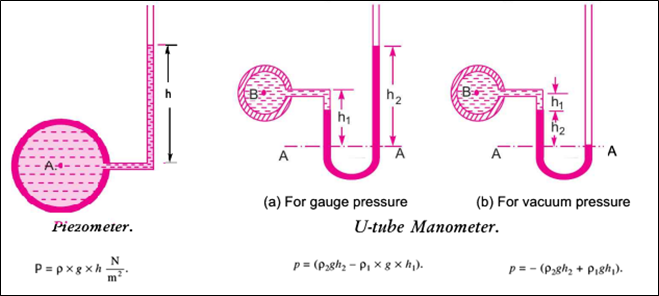 1. Piezometer: It is the simplest form of manometer used for measuring gauge pressures. One end of this manometer is connected to the point where pressure is to be measured, and the other end is open to the atmosphere.