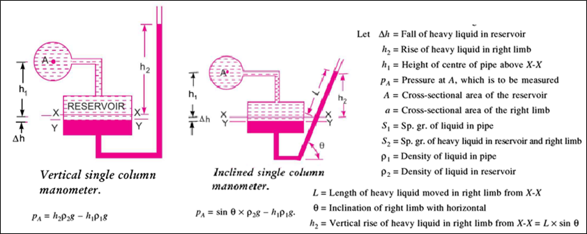 3. Single Column Manometer: A single-column manometer is a modified form of a U-tube manometer in which a reservoir, having a large cross-sectional area (about 100 times) as compared to the area of the tube, is connected to one of the limbs (say, the left limb) of the manometer.