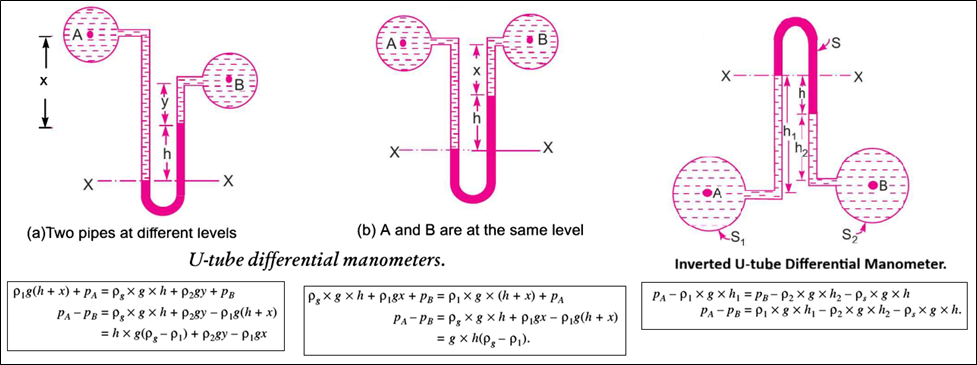 A differential manometer consists of a U-tube, containing a heavy liquid, whose two ends are connected to the points whose difference of pressure is to be measured. The most common types of differential manometers are :