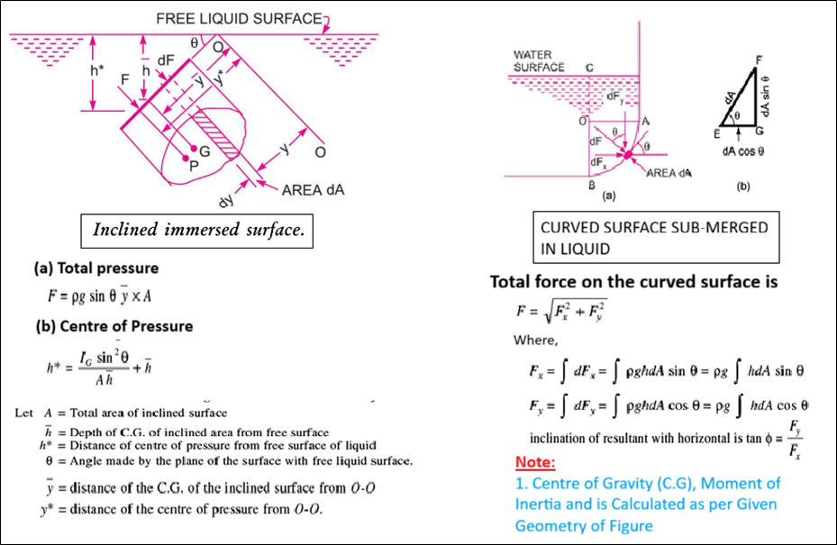 There are four cases of submerged surfaces on which the total pressure force and centre of pressure are to be determined. The submerged surfaces may be: