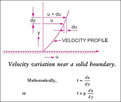 When two layers of a fluid, a distance ‘dy’ apart, move one over the other at different velocities, say u and u + du as shown in Fig. the viscosity together with relative velocity causes a shear stress acting between the fluid layers.